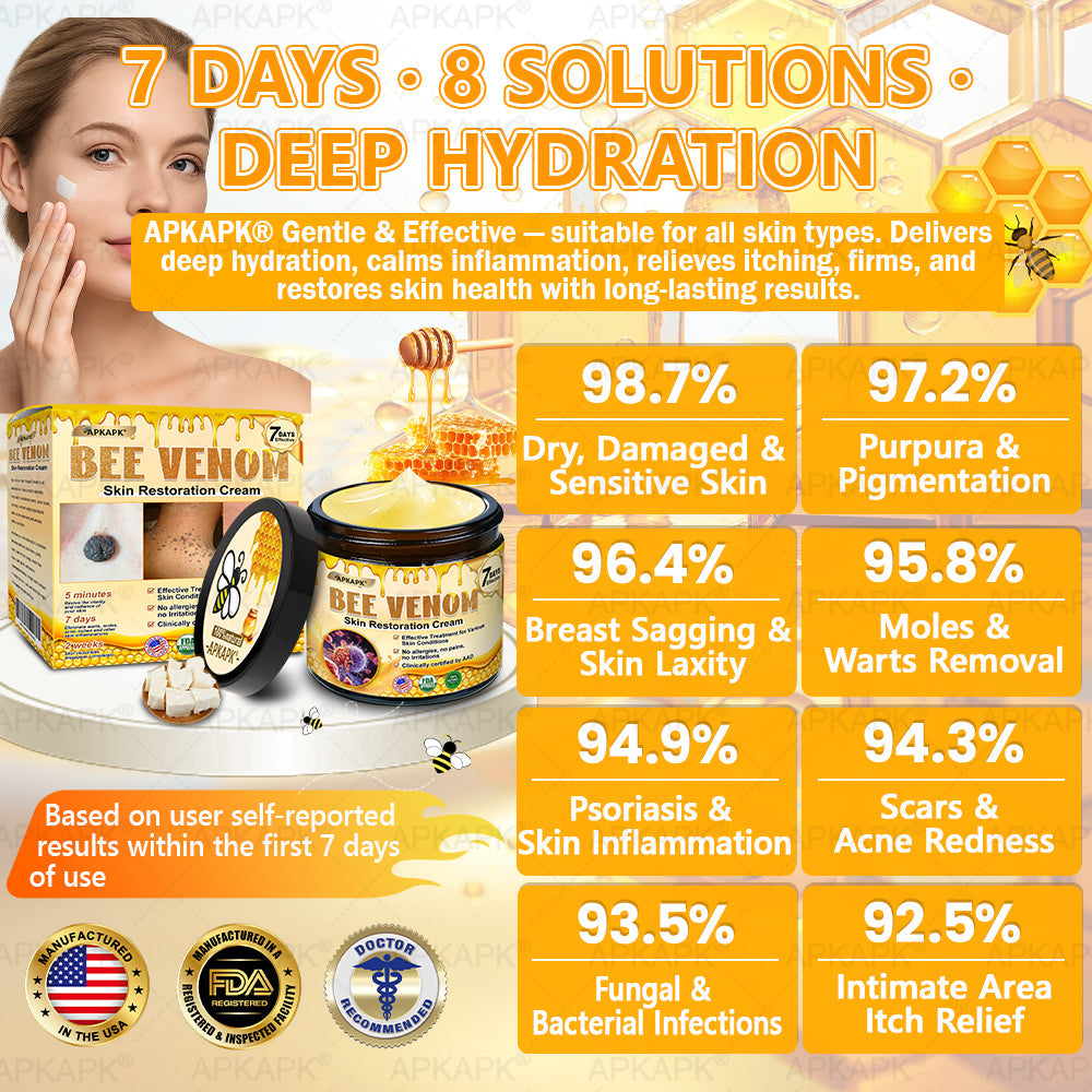 Clinically tested by dermatologists, APKAPKยฎ 8-In-1 Bee Venom & Tallow Skin Firming & Treatment Cream can improve dryness, inflammation, itching, and signs of aging within 7 days.